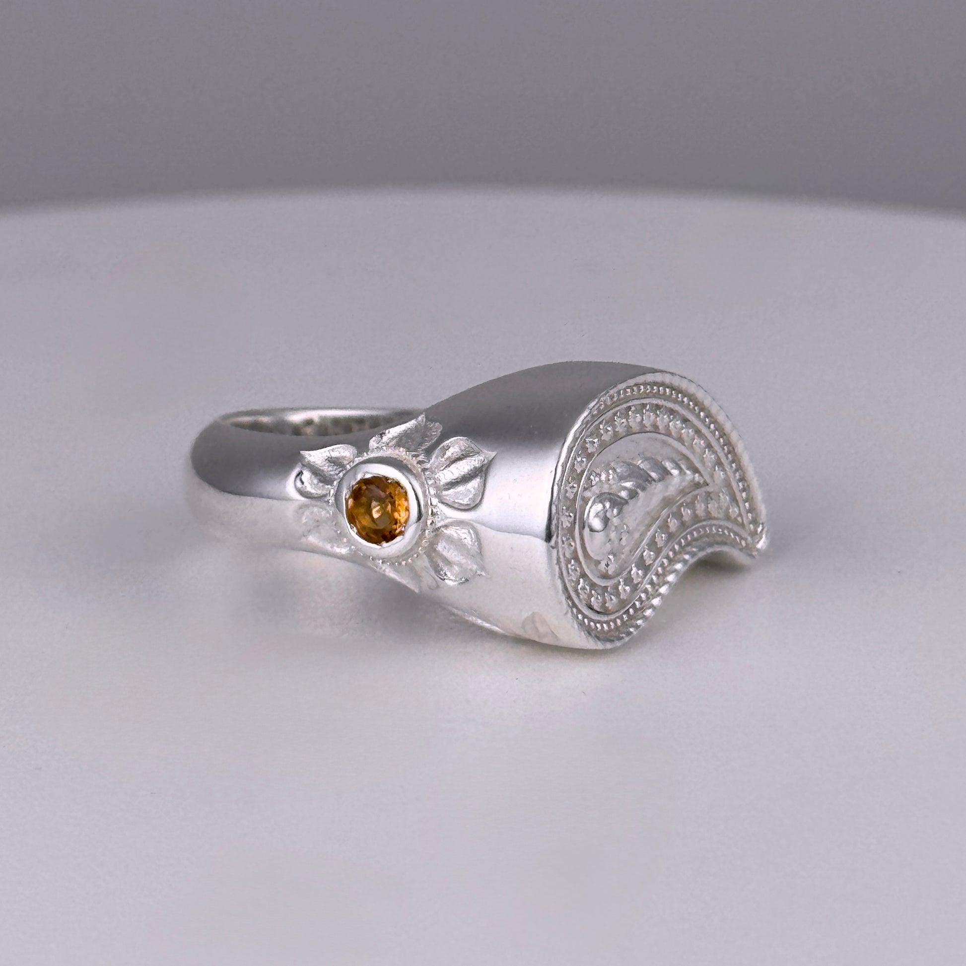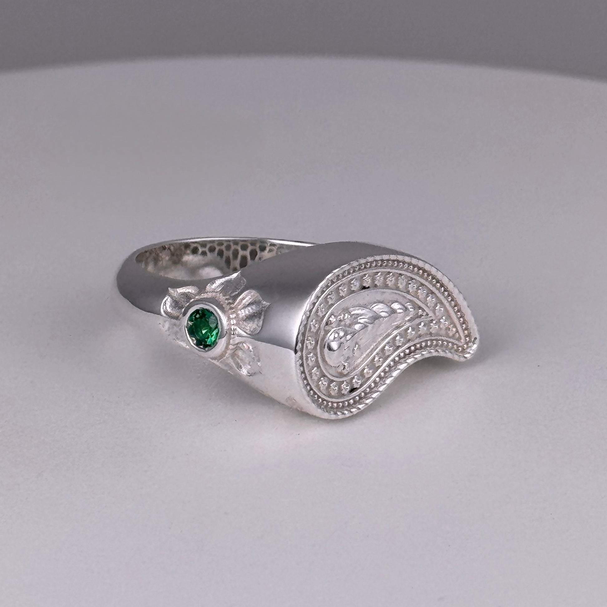 In this, our latest and most humble addition to the timeless fabric of the paisley story, we embrace the past with a flourish into the future. Each ring showcases ornate detail while profiling a unique floral design along the shank. Each flower, in turn, is complemented with an inlaid gemstone of your choosing.